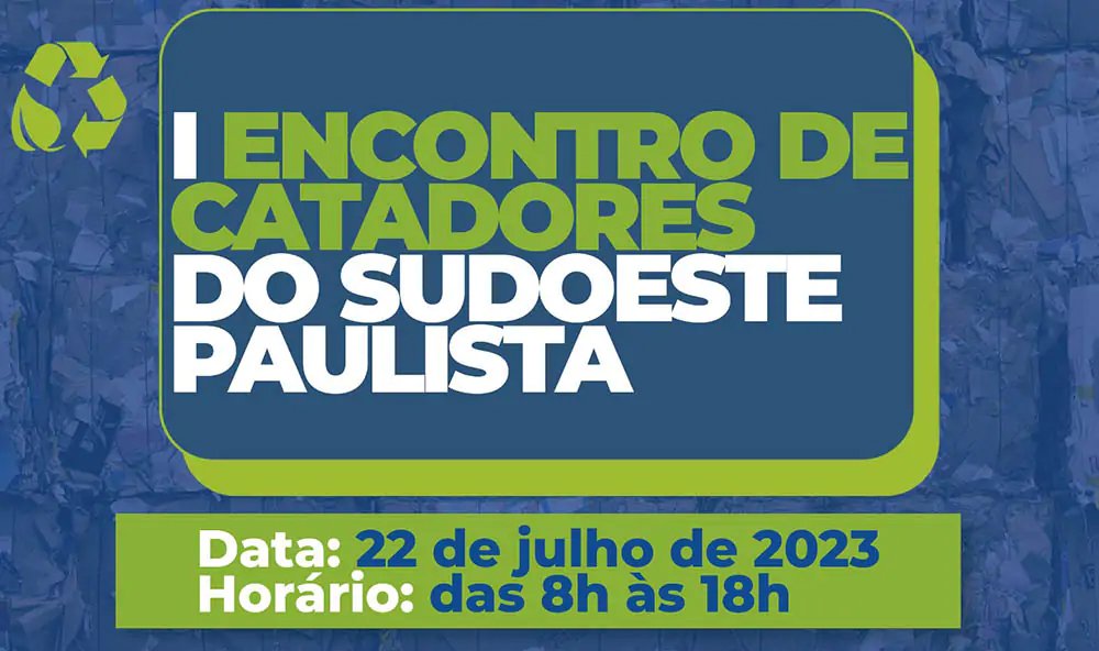 A Prefeitura de Itapeva, por meio da Secretaria de Recursos Hídricos e Meio Ambiente, em parceria com as Cooperativas de Catadores de Itapeva, promove o 1º Encontro de Catadores de Materiais Recicláveis do Sudoeste Paulista, que será realizado neste sábado, dia 22 de julho, das 8h às 18h, no Auditório da Escola Municipal Profª Thereza Silveira Melo, situado na Rua Josino Brizola Santos, nº 123, Vila São Miguel. O evento, sediado por Itapeva, contará com a participação de outros 16 municípios da região, sendo eles: Capão Bonito, Ribeirão Grande, Sarapuí, São Miguel Arcanjo, Itapetininga, Tatuí, Votorantim, Angatuba, Paranapanema, Campina do Monte Alegre, Pirajú, Ipaussu, Fartura, Taguaí, Apiaí e Itararé.