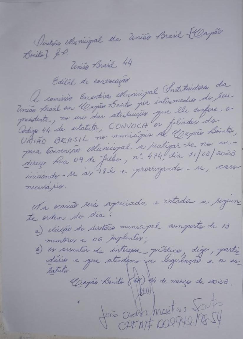 A Comissão Executiva Municipal Instituidora do UNIÃO BRASIL em Capão Bonito por intermédio do seu presidente, no uso das atribuições que lhe confere o art. 24 do estatuto, CONVOCA os filiados do UNIÃO BRASIL no município de Capão Bonito, para a CONVENÇÃO MUNICIPAL a realizar-se no endereço Rua 09 de Julho, nº 474 dia 31/03/2023 iniciando-se às 18h e prorrogando-se, caso necessário.