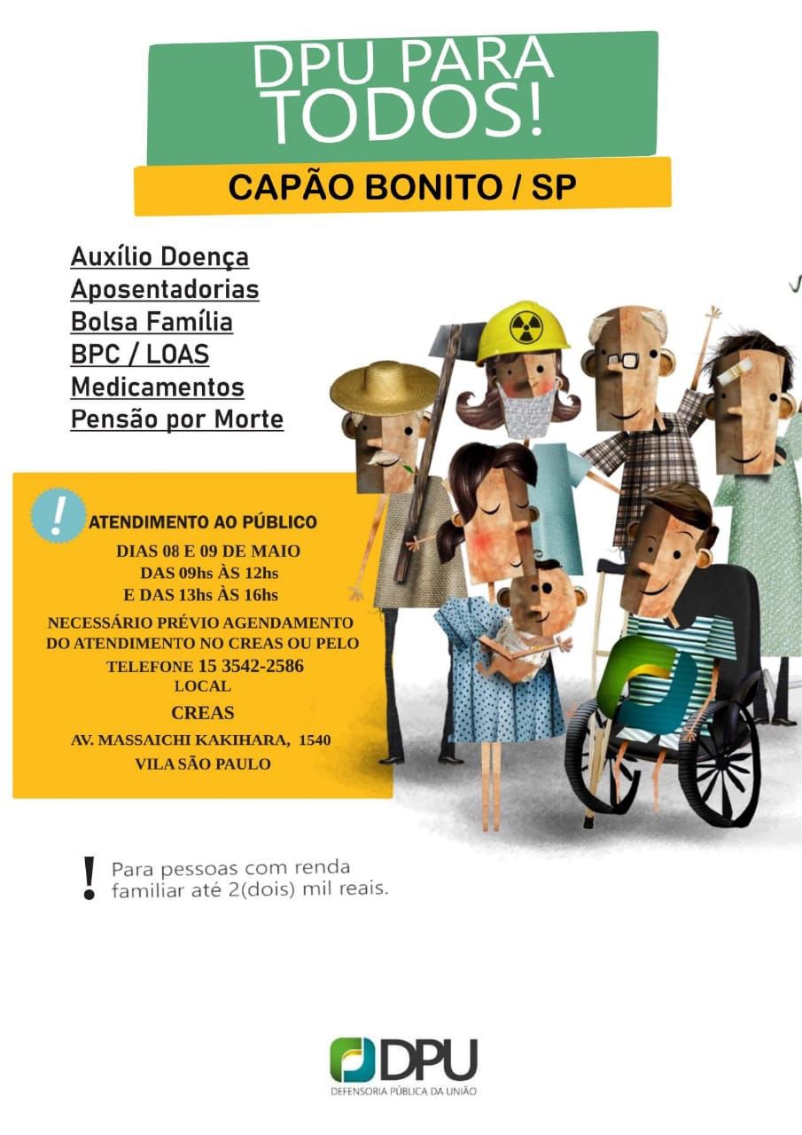 ORIENTAÇÃO JURÍDICA | Através da parceria firmada entre a Secretaria Municipal de Desenvolvimento Social e a Defensoria Pública da União (DPU), Capão Bonito sediará nos dias 08 e 09 de maio, a segunda edição do mutirão para oferta gratuita de orientações jurídicas sobre temas como aposentadoria, auxílio-doença, auxílio emergencial, Benefício de Prestação Continuada (BPC/LOAS), pensão por morte e demais demandas na esfera Federal.