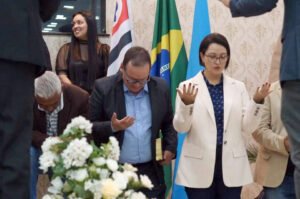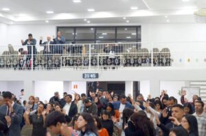 O prefeito Júlio Fernando ao lado da primeira-dama e secretária de Educação – Ana Luiza, o secretário de Governo – José Toshio Saito, os vereadores Alan Senciatti, Antônio Roberto de Siqueira (Fio) e Neto Ribeiro e demais integrantes da equipe de Governo Municipal foram recepcionados pelo pastor rev. Eliezer Barbosa, sua esposa Kelly, todos os membros da Igreja e pastores convidados de outras denominações.