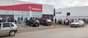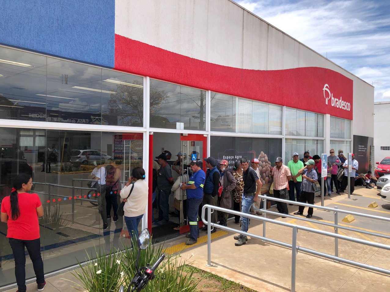 Debaixo de sol e chuva… a fila na agência do Bradesco continua aumentando…