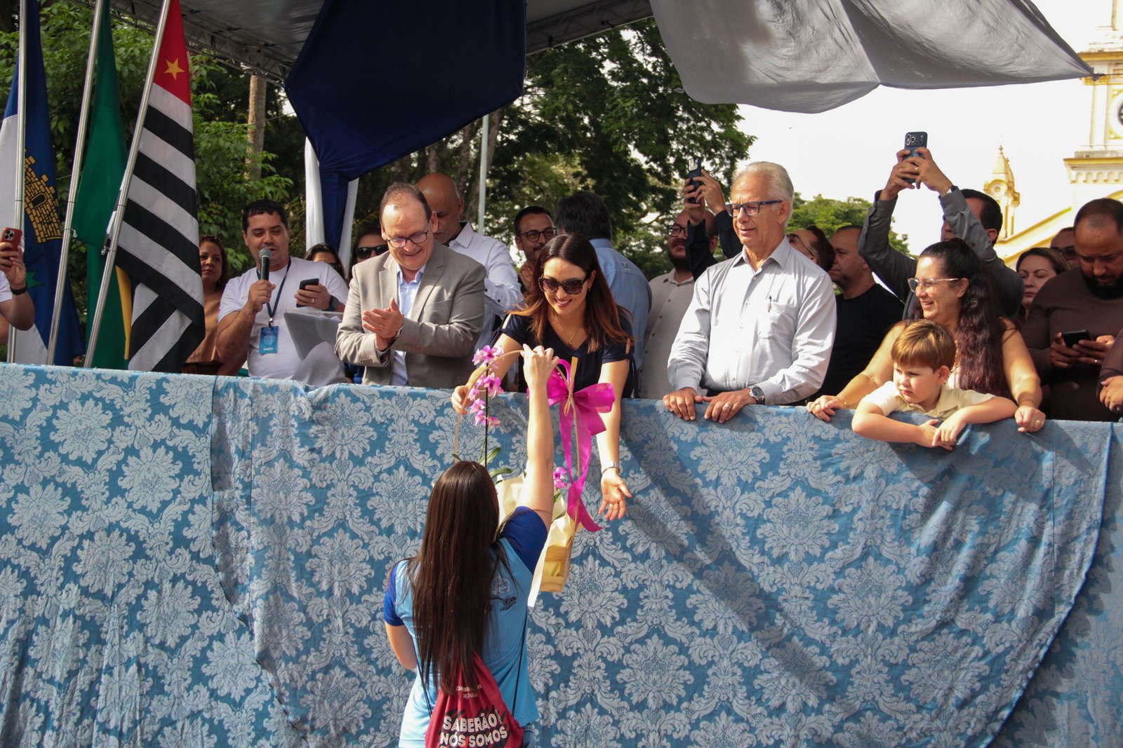 O prefeito Júlio Fernando, acompanhado da primeira-dama Ana Luiza, do vice-prefeito Roberto Tamura e do deputado estadual Edson Giriboni, acompanhou o desfile e recebeu homenagens no palco montado para as autoridades.