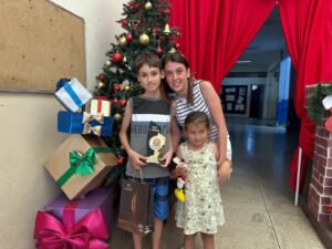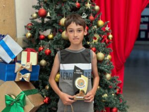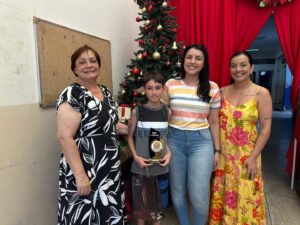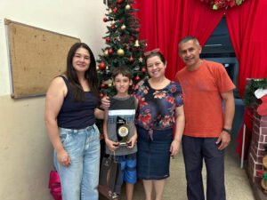O aluno Entone Siqueira Furquim recebeu o prêmio em sua própria escola, em um momento marcado pela presença de professores, equipe escolar e familiares, reforçando a importância do apoio da comunidade escolar e da família no processo educacional.