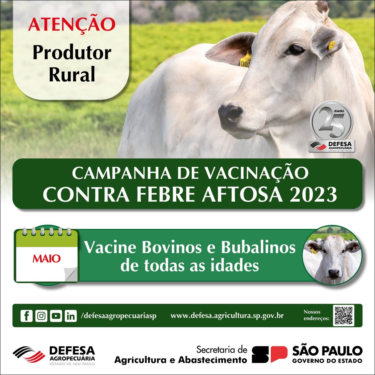 AFTOSA | A Coordenadoria de Defesa Agropecuária (CDA) da Secretaria de Agricultura e Abastecimento (SAA) informa que a campanha de vacinação contra a febre aftosa no Estado de São Paulo tem início no próximo dia 1º de maio. Diferente da campanha de 2022, nesta etapa deverão ser vacinados bovinos e bubalinos de todas as faixas etárias, o que corresponde a 11 milhões de animais.