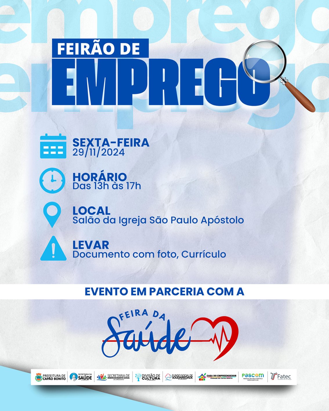 EMPREGO E SAÚDE | Hoje, sexta-feira, 29 de novembro, Capão Bonito realizará um importante Mutirão de Empregos e Feira da Saúde, das 13h00 às 17h00, no Pátio da Matriz São Paulo Apóstolo, localizado na Avenida Massaichi Kakihara.