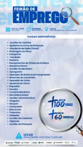 O Mutirão de Empregos, promovido pela Casa do Empreendedor e o PAT (Posto de Atendimento ao Trabalhador), oferecerá diversas vagas de emprego, além de orientações para quem busca se reposicionar no mercado de trabalho.