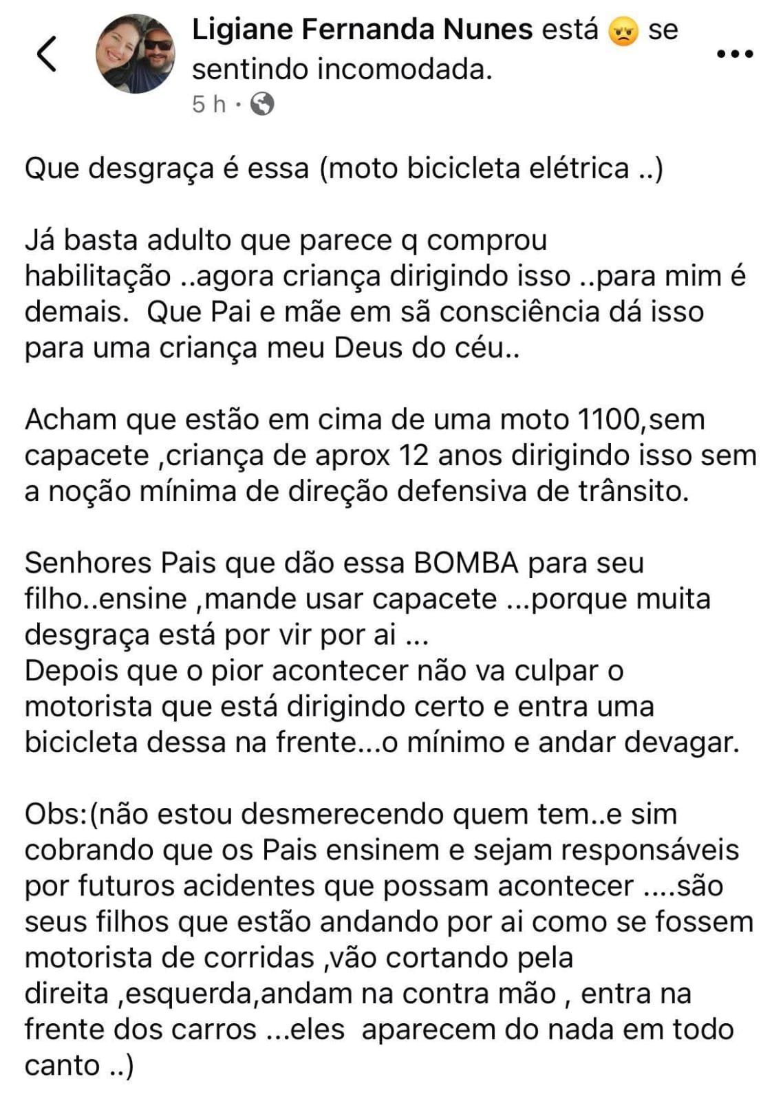 Nota da redação: O alerta feito pela cidadã é pertinente e reforça a necessidade de maior responsabilidade no uso de bicicletas e motos elétricas por menores. A orientação dos pais e o respeito às regras básicas de segurança são fundamentais para evitar acidentes e preservar vidas no trânsito.