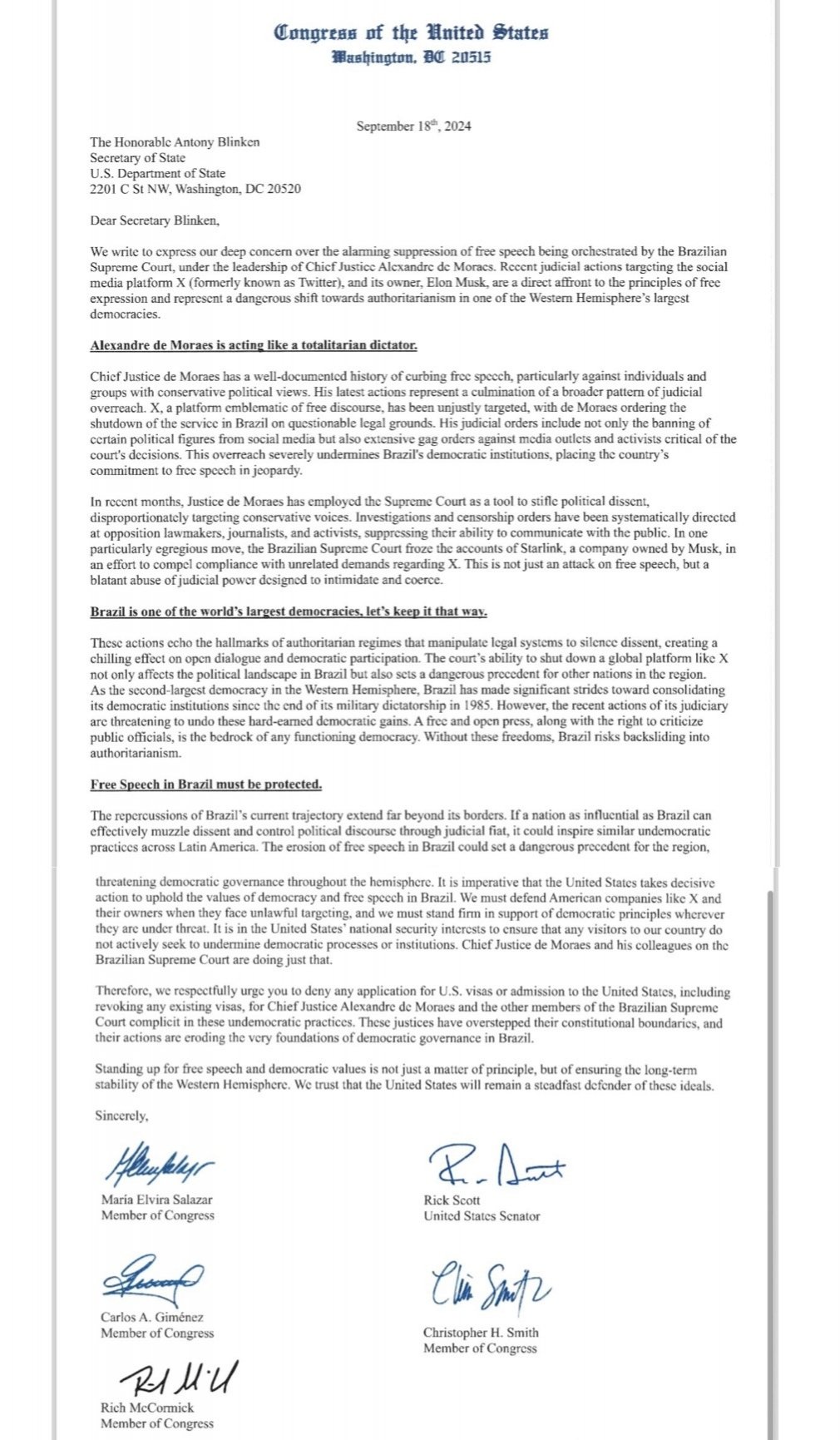 Após listar pontos antidemocráticos, solicitam que seja negada qualquer aplicação de vistos dos EUA ou admissão ao país norte-americano, incluindo a revogação de quaisquer vistos existentes, para o ministro Alexandre de Moraes e os outros membros do STF “envolvidos nessas práticas antidemocráticas”. Consideram que “esse juízes ultrapassaram seus limites constitucionais e suas ações estão corroendo os próprios alicerces da governança democrática no Brasil. Defender a liberdade de expressão e os valores democráticos não é apenas uma questão de princípio, mas de garantir a estabilidade de longo prazo do Hemisfério Ocidental. Confiamos que os Estados Unidos permanecerão um defensor firme desses ideais”.