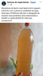 Nas redes sociais…Bairro rural Apiaí Mirim sofrendo com a péssima qualidade de água…