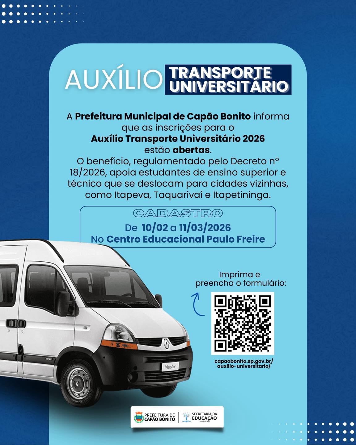 AUXÍLIO TRANSPORTE | A Prefeitura de Capão Bonito reabriu a pré-inscrição para o Auxílio Transporte Universitário 2026, benefício destinado a estudantes de Ensino Superior e cursos técnicos que se deslocam diariamente para instituições localizadas em Itapeva, Taquarivaí e Itapetininga.