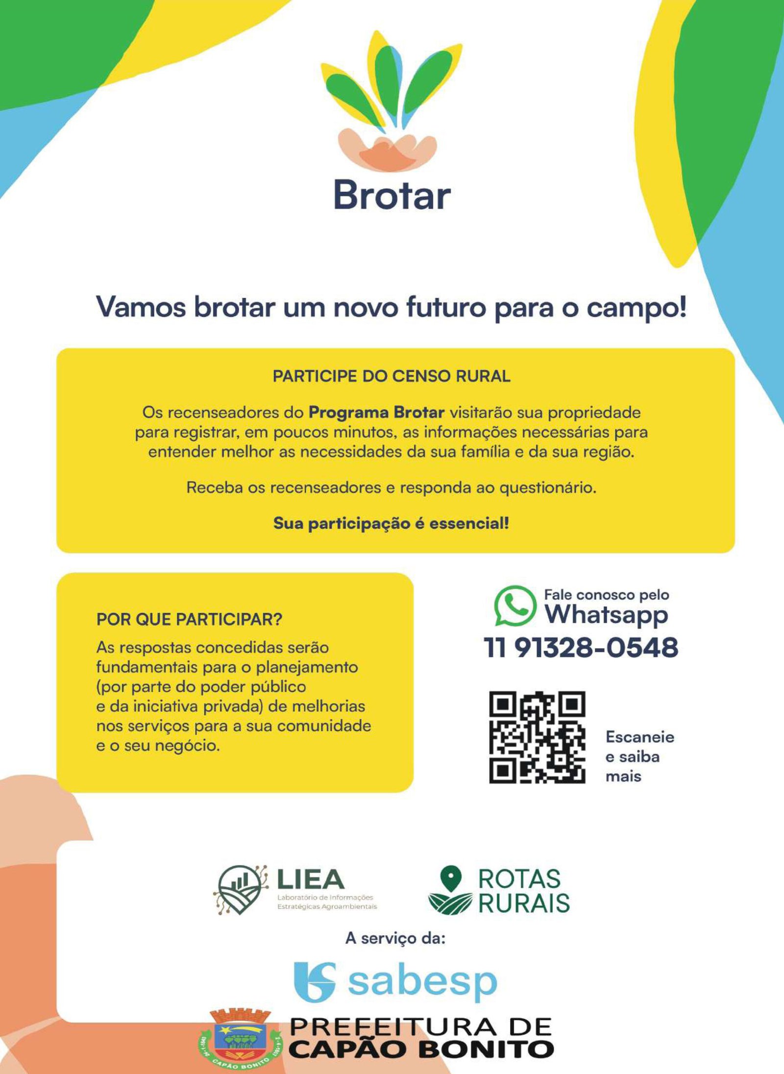 Após a conclusão do censo, a Sabesp irá apresentar soluções sob medida para cada região, buscando otimizar a chegada de água de qualidade, bem como a implantação de redes de coleta e tratamento de esgoto. O Projeto Brotar é executado pela Sabesp em parceria com o Laboratório de Informações Estratégicas Agroambientais do Instituto de Economia Agrícola (IEA), desenvolvedor do Programa Rotas Rurais, e com a Fundação de Desenvolvimento da Pesquisa do Agronegócio (Fundepag).