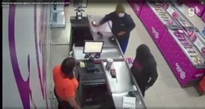Nas imagens, é possível ver que um homem, de capuz verde, se aproxima do caixa, e, em seguida, seu comparsa aparece. A funcionária abre a caixa registradora e os homens pegam o dinheiro.