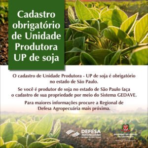 CADASTRAMENTO | A Coordenadoria de Defesa Agropecuária (CDA) da Secretaria de Agricultura e Abastecimento (SAA) do Estado de São Paulo e a Casa do Agricultor de Capão Bonito alertam sobre a obrigatoriedade do cadastro de Unidade Produtora (UP) de soja no Sistema Informatizado de Gestão de Defesa Animal e Vegetal (GEDAVE).